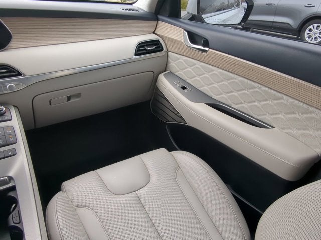 12 Speakers, 3.648 Axle Ratio, 3rd row seats: split-bench, 4-Wheel Disc Brakes, ABS brakes, Air Conditioning, Alloy wheels, AM/FM radio: SiriusXM, Apple CarPlay & Android Auto, Auto High-beam Headlights, Auto-dimming Rear-View mirror, Auto-leveling suspension, Automatic temperature control, Brake assist, Bumper Applique, Bumpers: body-color, Cargo Net, Cargo Tray, Carpeted Floor Mats, Compass, Delay-off headlights, Driver door bin, Driver vanity mirror, Dual front impact airbags, Dual front side impact airbags, Electronic Stability Control, Emergency communication system: Blue Link Connected Car Service (3-year complimentary subscription), Four wheel independent suspension, Front anti-roll bar, Front Bucket Seats, Front Center Armrest, Front dual zone A/C, Front reading lights, Fully automatic headlights, Garage door transmitter: HomeLink, harman/kardon® Speakers, Heads-Up Display, Heated & Ventilated Front Bucket Seats, Heated door mirrors, Heated front seats, Heated rear seats, Heated steering wheel, Illuminated entry, Knee airbag, Low tire pressure warning, Memory seat, Navigation System, Occupant sensing airbag, Option Group 01, Outside temperature display, Overhead airbag, Overhead console, Panic alarm, Passenger door bin, Passenger vanity mirror, Power door mirrors, Power driver seat, Power Liftgate, Power moonroof, Power passenger seat, Power steering, Power windows, Premium Nappa Leather Seat Trim, Radio data system, Radio: AM/FM/MP3 Premium Audio System, Rain sensing wipers, Rear air conditioning, Rear anti-roll bar, Rear reading lights, Rear window defroster, Rear window wiper, Reclining 3rd row seat, Remote keyless entry, Security system, Speed control, Speed-sensing steering, Split folding rear seat, Spoiler, Steering wheel mounted audio controls, Tachometer, Telescoping steering wheel, Tilt steering wheel, Traction control, Trip computer, Turn signal indicator mirrors, Variably intermittent wipers, Ventilated front seats, Ventilated rear seats, Wheels: 20" x 7.5J Calligraphy Exclusive Alloy.