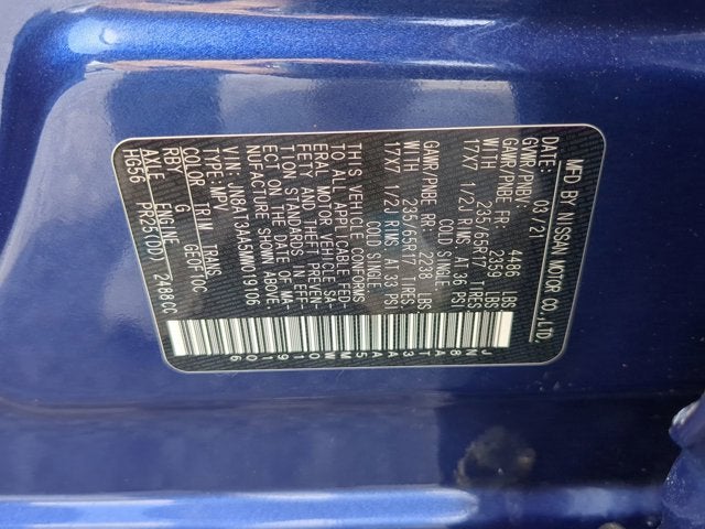 17" Aluminum Alloy Wheels, 4 Speakers, 4-Wheel Disc Brakes, 5.604 Axle Ratio, ABS brakes, Air Conditioning, Alloy wheels, AM/FM Radio, AM/FM radio, Auto High-beam Headlights, Black Splash Guards (Set of 4), Blind Spot Warning, Brake assist, Bumpers: body-color, Cloth Seat Trim, Delay-off headlights, Driver door bin, Driver vanity mirror, Dual front impact airbags, Dual front side impact airbags, Electronic Stability Control, First Aid Kit, Floor Mats w/1-Piece Cargo Area Protector, Four wheel independent suspension, Front anti-roll bar, Front Bucket Seats, Front Center Armrest, Front reading lights, Fully automatic headlights, Illuminated entry, Knee airbag, Low tire pressure warning, NissanConnect featuring Apple CarPlay and Android Auto, Occupant sensing airbag, Outside temperature display, Overhead airbag, Overhead console, Panic alarm, Passenger door bin, Passenger vanity mirror, Power door mirrors, Power steering, Power windows, Radio data system, Rear anti-roll bar, Rear Parking Sensors, Rear seat center armrest, Rear side impact airbag, Rear window defroster, Rear window wiper, Remote keyless entry, Speed control, Speed-Sensitive Wipers, Split folding rear seat, Spoiler, Steering wheel mounted audio controls, Tachometer, Telescoping steering wheel, Tilt steering wheel, Traction control, Trip computer, Variably intermittent wipers.