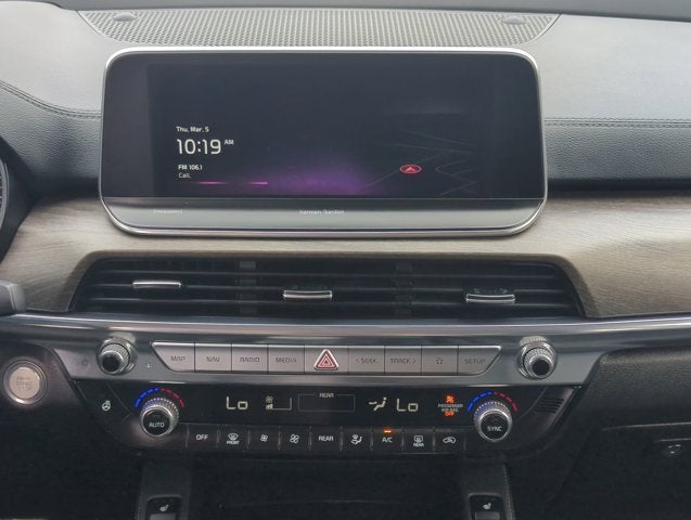 10 Speakers, 110V Inverter, 3.648 Axle Ratio, 3rd row seats: split-bench, 4-Wheel Disc Brakes, ABS brakes, Air Conditioning, Alloy wheels, AM/FM radio: SiriusXM, Apple CarPlay & Android Auto, Auto High-beam Headlights, Auto-dimming Rear-View mirror, Automatic temperature control, Black Finish Radiator Grille, Body Color Exterior Door Handles, Brake assist, Bumpers: body-color, Cargo Seatback Up Mat, Carpeted Floor Mats, Compass, Delay-off headlights, Driver door bin, Driver vanity mirror, Dual front impact airbags, Dual front side impact airbags, Electronic Stability Control, Emergency communication system: 911 Connect, Exclusive Black Fog Light Bezel, Exclusive Black Headlight Bezels, Four wheel independent suspension, Front & Rear Gloss Black Finish Bumper Skid Plates, Front anti-roll bar, Front Bucket Seats, Front Center Armrest, Front dual zone A/C, Front fog lights, Front reading lights, Fully automatic headlights, Garage door transmitter: HomeLink, Gloss Black Finish Exterior Emblems, Gloss Black Finish Front & Rear Door Garnish, Gloss Black Finish Roof Rails, harman/kardon® Speakers, Heads-Up Display, Heated & Ventilated 2nd Row Seats, Heated & Ventilated Front Bucket Seats, Heated door mirrors, Heated front seats, Heated steering wheel, Hybrid Cargo Net, Illuminated entry, Knee airbag, Leather Seat Trim, Leather Shift Knob, Leather steering wheel, Low tire pressure warning, Memory seat, Navigation System, Nightfall Edition Package, Occupant sensing airbag, Outside temperature display, Overhead airbag, Overhead console, Panic alarm, Passenger door bin, Passenger vanity mirror, Power door mirrors, Power driver seat, Power Liftgate, Power moonroof, Power passenger seat, Power steering, Power windows, Premium Cloth Headliner & Pillar Trim, Premium Nappa Leather Seat Trim, Radio data system, Radio: AM/FM harman/kardon Audio System, Rain-Sensing Front Windshield Wipers, Rear air conditioning, Rear anti-roll bar, Rear audio controls, Rear reading lights, Rear window defroster, Rear window wiper, Reclining 3rd row seat, Remote keyless entry, Roof rack: rails only, Security system, Smart Key w/ Push Button and Remote Start, Speed control, Speed-sensing steering, Split folding rear seat, Spoiler, Steering wheel mounted audio controls, SX Prestige Package, Tachometer, Telescoping steering wheel, Tilt steering wheel, Traction control, Trip computer, Turn signal indicator mirrors, Variably intermittent wipers, Ventilated front seats, Wheels: 20" x 7.5" Black Alloy, Wheels: 20" x 7.5" Exclusive Black Alloy.