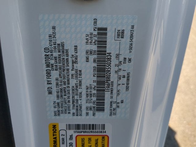 12 Speakers, 4-Wheel Disc Brakes, ABS brakes, Active Anti-Theft System, Adaptive Speed Control w/Stop & Go, Adaptive suspension, Air Conditioning, Alloy wheels, AM/FM radio: SiriusXM with 360L, AM/FM Stereo, Auto High-beam Headlights, Auto-dimming Rear-View mirror, Automatic temperature control, B&O Sound System by Bang & Olufsen, Brake assist, Bumpers: body-color, Cloth/Vinyl Heated Bucket Seats, Compass, Connected Built-In Navigation, Delay-off headlights, Driver door bin, Driver vanity mirror, Dual front impact airbags, Dual front side impact airbags, Electronic Stability Control, Electronic-Locking Center Console, Emergency communication system: 911 Assist, Equipment Group 600A High Package, Exterior Parking Camera Rear, Ford Co-Pilot360 Assist+, Four wheel independent suspension, Front anti-roll bar, Front Bucket Seats, Front Center Armrest, Front dual zone A/C, Front reading lights, Fully automatic headlights, Grabber Blue Brake Calipers w/White Logo, HD Radio, Heated front seats, Heated steering wheel, Illuminated entry, Knee airbag, Lane-Keeping System w/Lane Keeping Aid, Low tire pressure warning, Navigation system: Connected Navigation, Occupant sensing airbag, Outside temperature display, Overhead airbag, Overhead console, Panic alarm, Passenger door bin, Passenger vanity mirror, Power door mirrors, Power driver seat, Power passenger seat, Power steering, Power windows, Radio data system, Rain sensing wipers, Rear anti-roll bar, Rear Parking Sensors, Rear window defroster, RECARO Micro-Suede/Vinyl Bucket Seats, RECARO Sport Seats, Remote keyless entry, Security Package, SiriusXM w/360L, Speed control, Speed-sensing steering, Speed-Sensitive Wipers, Split folding rear seat, Spoiler, Sport steering wheel, Steering wheel mounted audio controls, SYNC 4.0 QNX, Tachometer, Tarnish Dark Low Gloss/Gloss Blk Vinyl Hood Stripe, Telescoping steering wheel, Tilt steering wheel, Traction control, Trip computer, Variably intermittent wipers, Voltmeter, Wheel Locking Kit, Wheels: 19" x 9.5" Fr & 19" x 10" Rr Aluminum.
