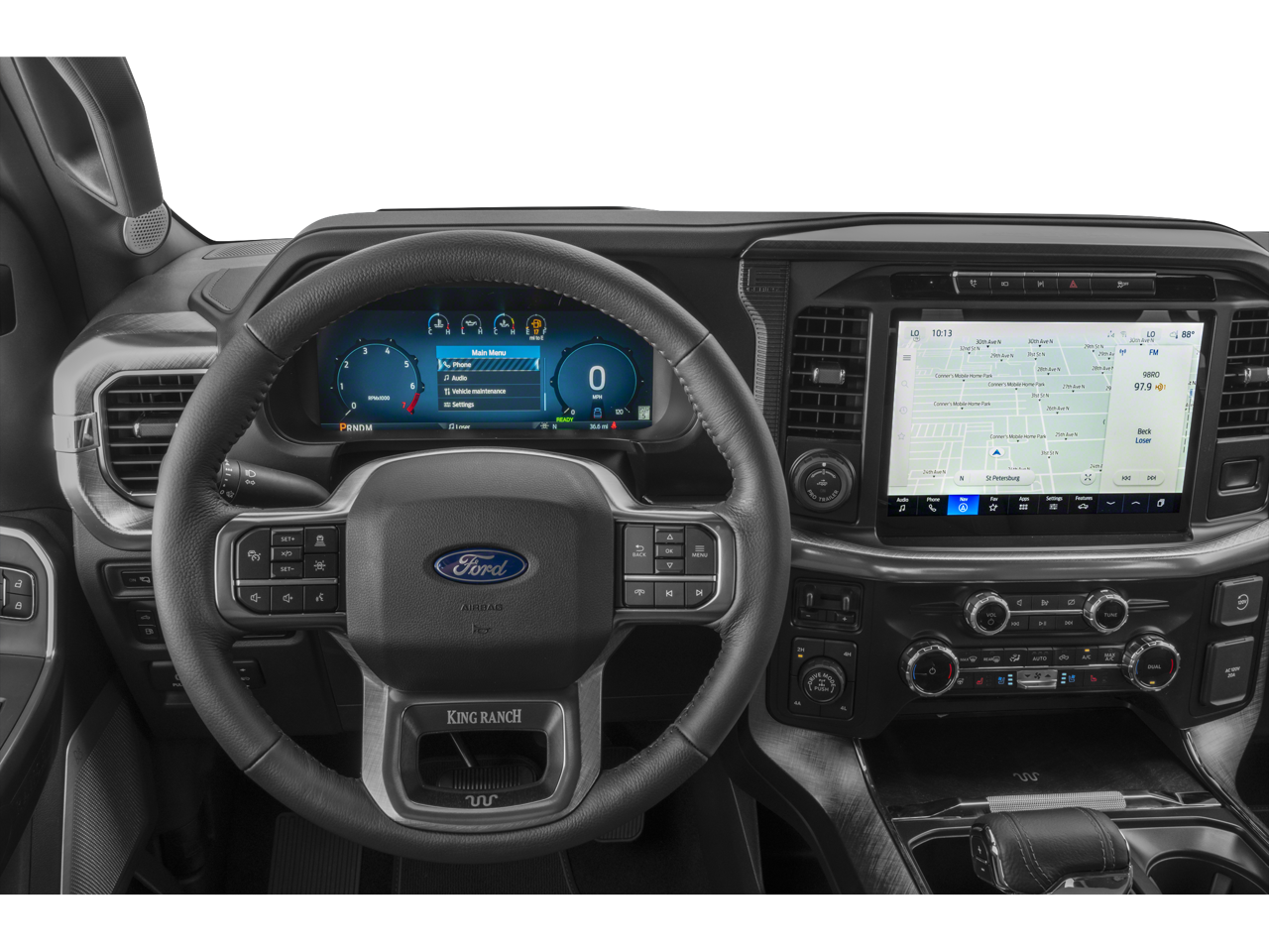 4WD, 14 Speakers, 4-Wheel Disc Brakes, ABS brakes, Adjustable pedals, Air Conditioning, Alloy wheels, AM/FM radio: SiriusXM with 360L, Auto High-beam Headlights, Auto tilt-away steering wheel, Auto-dimming door mirrors, Auto-dimming Rear-View mirror, Automatic temperature control, Brake assist, Chrome wheels, Compass, Delay-off headlights, Driver door bin, Driver vanity mirror, Dual front impact airbags, Dual front side impact airbags, Electronic Stability Control, Emergency communication system: SYNC 4 911 Assist, Equipment Group 601A High, Front anti-roll bar, Front Bucket Seats, Front Center Armrest, Front dual zone A/C, Front fog lights, Front License Plate Bracket, Front reading lights, Front wheel independent suspension, Fully automatic headlights, FX4 Off-Road Package, Garage door transmitter, Genuine wood dashboard insert, Heads-Up Display, Heated door mirrors, Heated front seats, Heated rear seats, Heated steering wheel, Illuminated entry, Internet access capable: FordPass Connect 5G, King Ranch Multicontour Leather Bucket Seats, Leather steering wheel, Low tire pressure warning, Memory seat, Navigation system: Connected Navigation, Occupant sensing airbag, Outside temperature display, Overhead airbag, Overhead console, Panic alarm, Passenger door bin, Passenger vanity mirror, Pedal memory, Power door mirrors, Power driver seat, Power moonroof, Power passenger seat, Power steering, Power windows, Radio data system, Radio: B&O Unleashed Sound System by Bang & Olufsen, Rain sensing wipers, Rear reading lights, Rear seat center armrest, Rear step bumper, Rear window defroster, Remote keyless entry, Security system, Speed control, Split folding rear seat, Steering wheel memory, Steering wheel mounted audio controls, SYNC 4 w/Enhanced Voice Recognition, Tachometer, Telescoping steering wheel, Tilt steering wheel, Traction control, Trip computer, Turn signal indicator mirrors, Variably intermittent wipers, Ventilated front seats, Voltmeter, Wheels: 20" Chrome-Like PVD, 4WD.